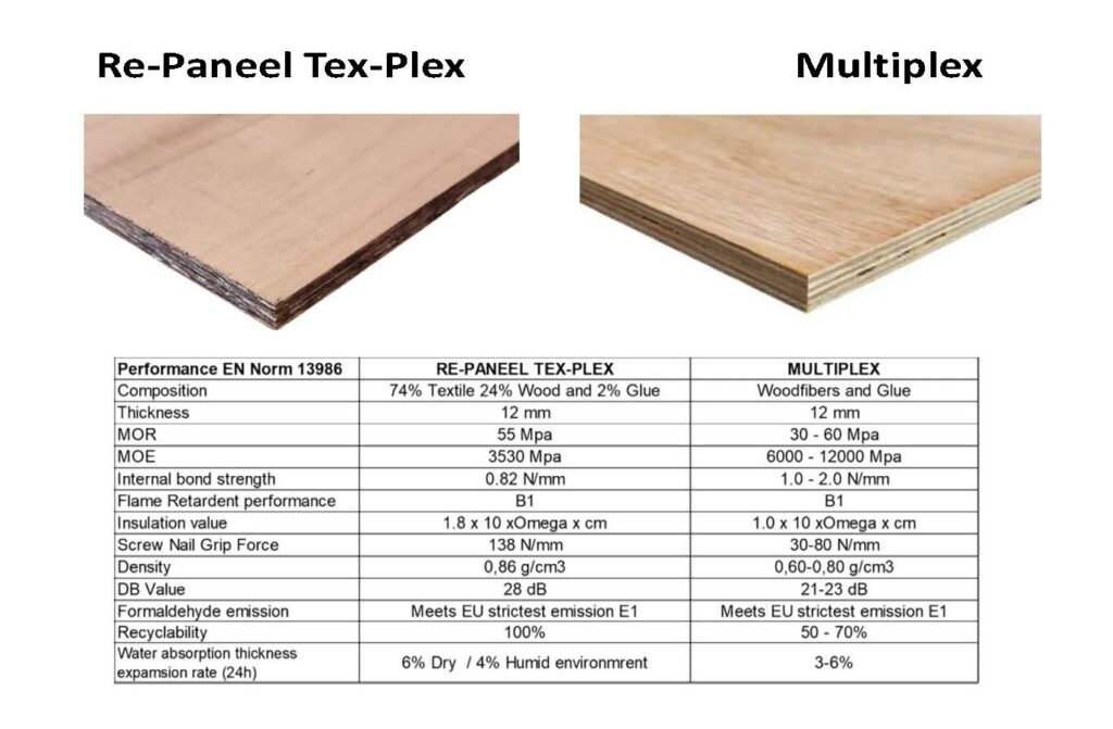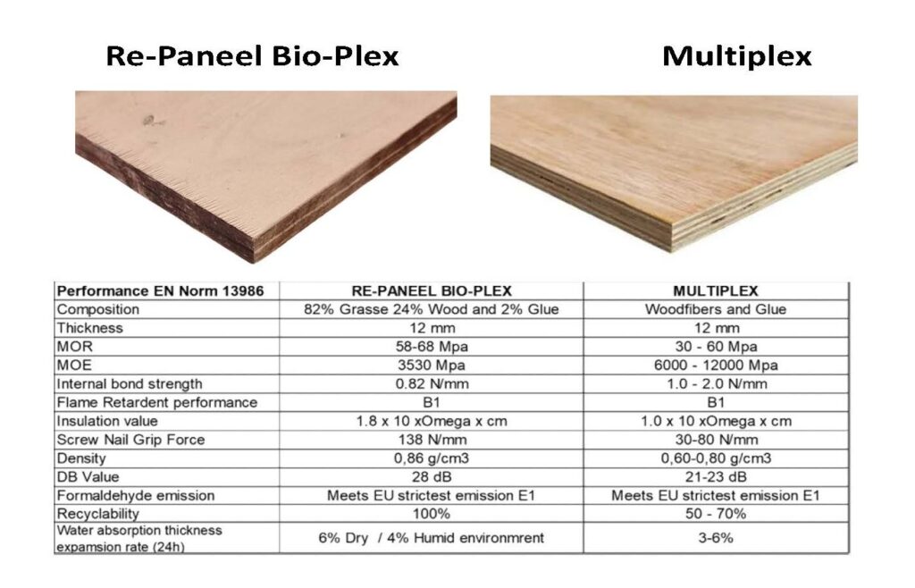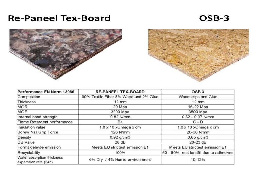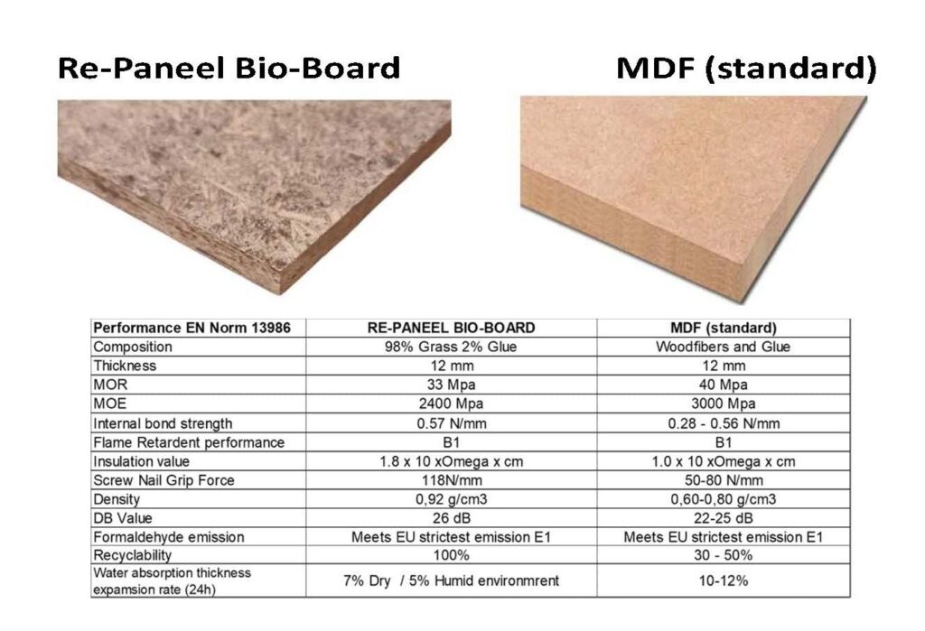 Our Re-Paneel Panels are tested according to the EU building standards, B1 Fire resistant compared to similar Wood based panels, with a higher MOR as well as Screw Nail Grip force, Moisture Resistance, Sound Dampening and Insulation
