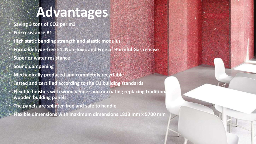 Our Re-Paneel Panels are tested according to the EU building standards, B1 Fire resistant and compared to similar Wood based panels, with a higher MOR as well as Screw Nail Grip force, Moisture Resistance, Sound Dampening and Insulation. Re-Paneel See our Collection Digital Catalogue.
