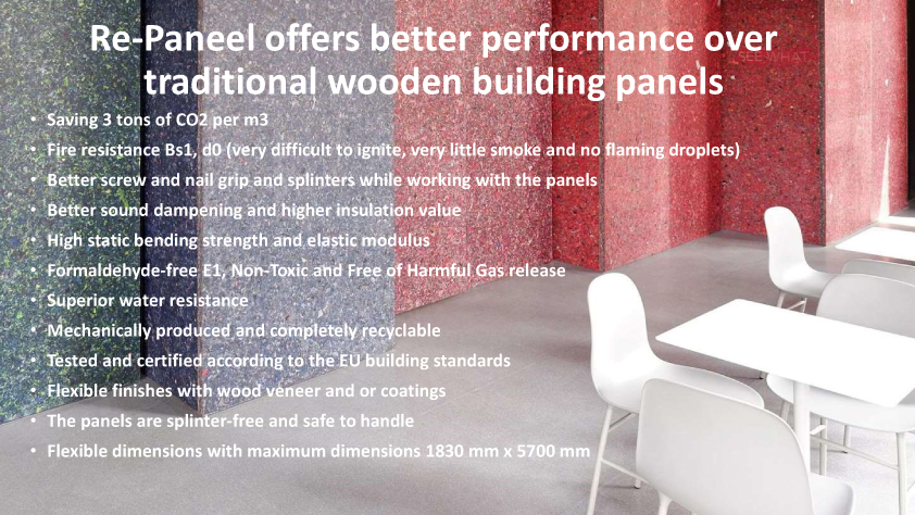 With our Circular Re-Paneel Building Panels, made of Textile- and Bio-Waste, mechanically produced and completely recyclable, you can help to re-build our Planet.